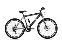 - 21-speed mountain bike features a full-suspension strong aluminum frame